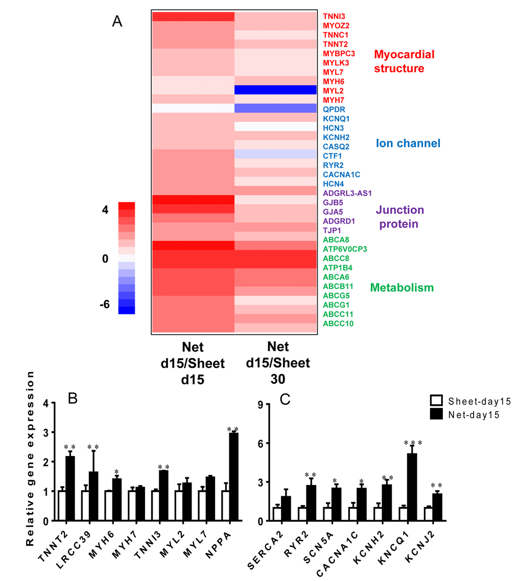 To assess the overall maturation status of the net-shaped and sheet-shaped CMs, we used RNAseq to examine the global gene expression profiles of the net-shaped CMs, sheet-shaped CMs and the long-term cultured CMs (30 days). Compared to the sheet-shaped CMs, the expression of 482 genes was decreased and the expression of 348 genes was increased in the net-shaped CMs. Meanwhile, 492 down-regulated and 410 up-regulated genes were observed in the net-shaped CMs compared with the long-term cultured CMs. We then performed a clustering analysis of differentially expressed genes to elucidate the mechanism of maturation induced by multicellular formation. The net-d15 CMs expressed higher levels of genes encoding contractile proteins, ion channels, junction proteins and metabolism-related proteins than the sheet-d15 CMs. Moreover, the fold change in cardiac maturation-related gene expression decreased in net-d15/sheet-d30 compared with the net-d15/sheet-d15, indicating that the net-shaped CMs were more similar to long-term cultured CMs (30 days) than to sheet-d15 (Figure 3A). We also analyzed the cellular area, cell perimeter, circularity index of the sheet-d15, net-d15 and sheet-d30. As shown in Figure S2, net-shaped CMs displayed cell areas that were similar to sheet-d30, but they had larger cell perimeters and lower circularity indexes (Figure S2). Based on these results, the maturation of net-shaped CMs was accelerated.