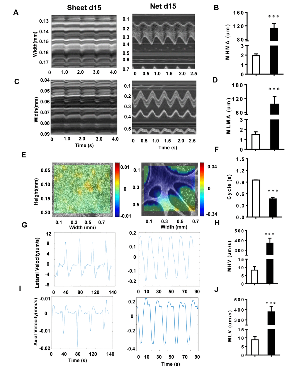 To further investigate the behavior of the two CM cluster shapes, we used a cross-correlation-based speckle tracking method to analyze the movement of the CMs. The results are shown in Figure 4. The maximum horizontal motion amplitude (MHMA) of the net-shaped CMs was 111.96±14.64 μm, and the maximum longitudinal motion amplitude (MLMA) was 95±32.8 μm. The MHMA and MLMA of the sheet-shaped CMs were 1.93±0.18 μm and 1.50±0.25 μm, respectively, which were significantly lower than the net-shaped CMs (Figure 4A-D). Moreover, the maximum velocity of the net-shaped CMs was significantly faster than that of the sheet-shaped CMs. The maximum horizontal velocity (MHV) of the net-shaped CMs was 372.00±50.17 μm/s, and the maximum longitudinal velocity (MLV) was 378.50±54.60 μm/s. The MHV and MLV of the sheet-shaped CMs were 8.30±2.31 μm/s and 8.90±1.92 μm/s, respectively (Figure 4E-J). Meanwhile, the motion cycle time of the net-shaped CMs (0.47±0.03 s) was significantly shorter than that of the sheet-shaped CMs (0.95±0.003 s) (Figure 4F).
