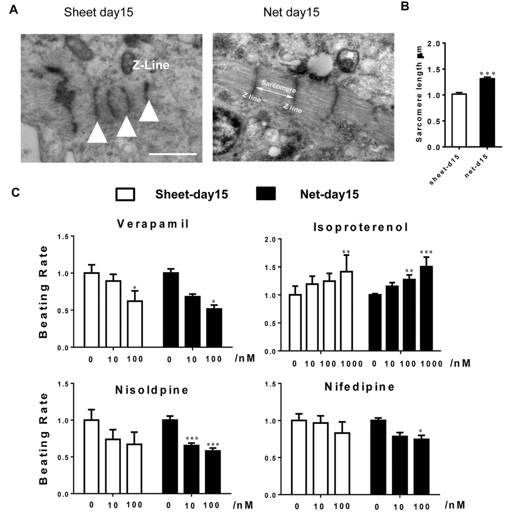 To assess the pharmacological responses of the net-shaped and sheet-shaped CMs, we treated the cells with several typical compounds that regulate cardiac functions, including the beta-adrenergic receptor agonist isoproterenol, the Kv11.1 and Cav1.2 channel antagonist verapamil, and the L-type Ca2+ channel antagonists nifedipine and nisoldipine. As shown in Figure 5C, both the net-shaped CMs and the sheet-shaped CMs positively responded to isoproterenol and negatively responded to verapamil, nifedipine and nisoldipine. In addition, upon treatment with isoproterenol, nisoldipine and nifedipine, net-shaped CMs were more sensitive to lower doses of compounds, as indicated by the relative changes in the beating rate.