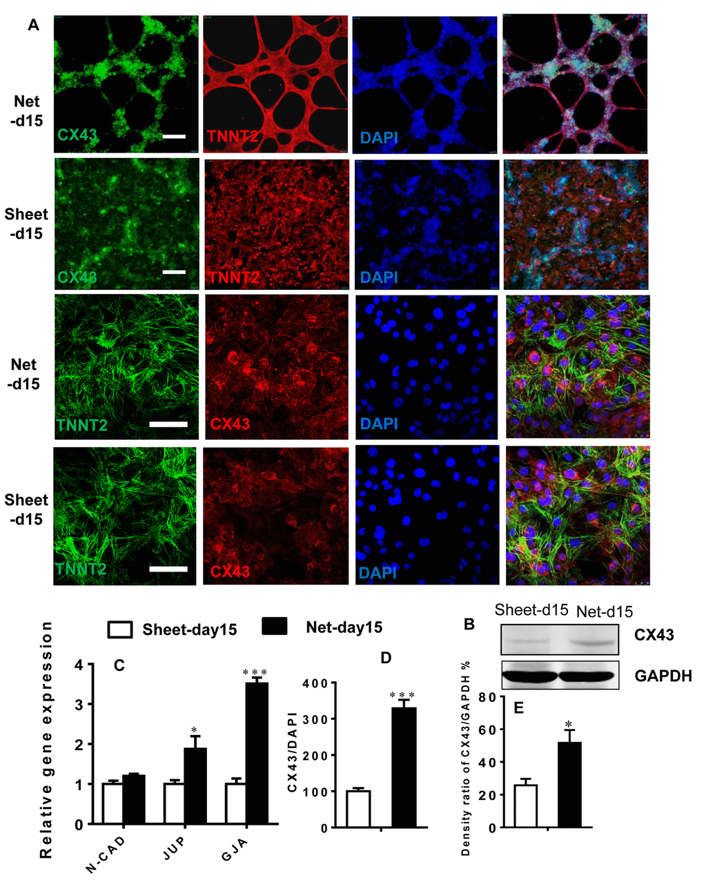 To determine the effect of CM shape on the expression of connection proteins typically found in the heart, we examined the proteins and RNA from net-shaped and sheet-shaped CMs. Connexin 43 (CX43, the primary gap junction in working CMs), plakoglobin (GUP) and N-cadherin (components of desmosomes and adherens junctions, respectively, located at intercalated discs in the human heart) were up-regulated (Figure 6C) in the net-shaped group. Western blots and immunostaining showed increased expression of CX43 in net-shaped compared with sheet-shaped CMs (Figure 6A, B, D, and E). The results indicated that robust contraction plays a vital role in the maturation of intercalated discs.