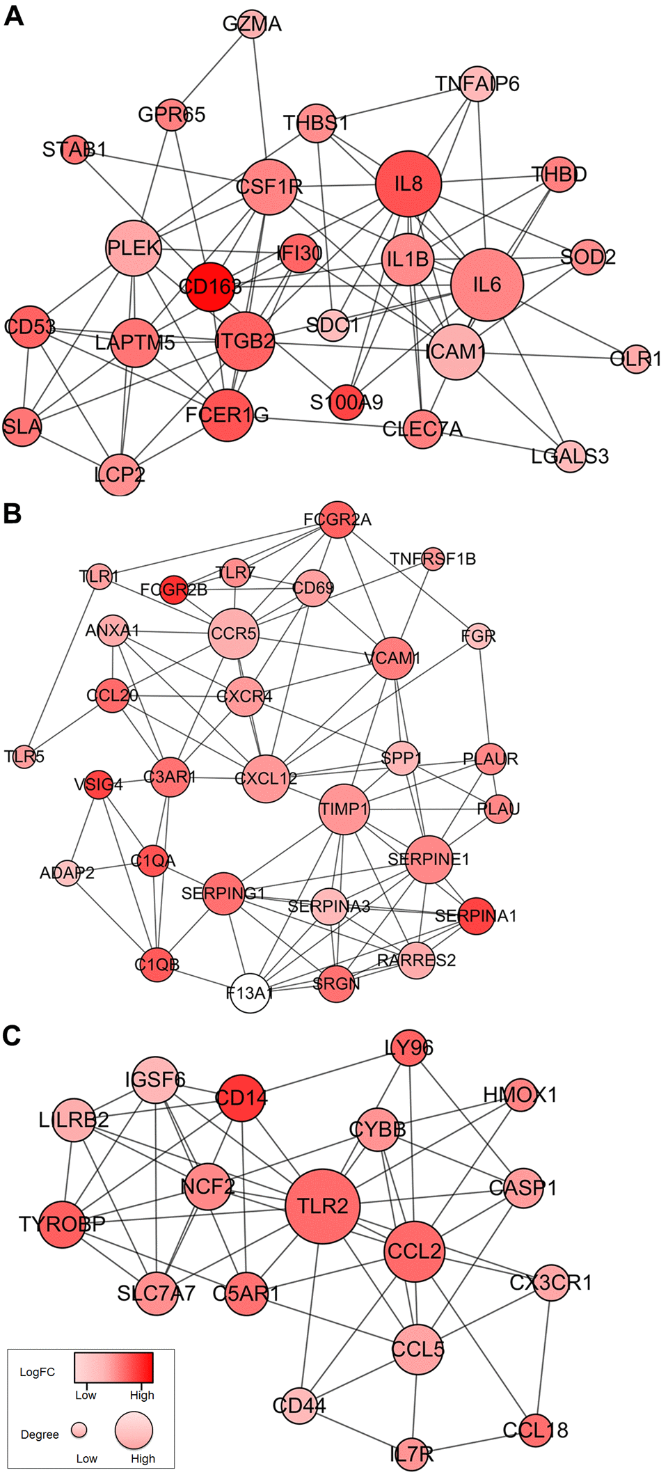 To better understand the interplay among the identified DEGs, we obtained protein-protein interaction (PPI) networks using the STRING tool. The network was made up of 8 modules, which included 224 nodes and 1,282 edges. We selected the top three significant modules for further analysis (Figure 4). For the convenience of description, we named these modules IL6, TIMP1, and TLR2 modules, respectively. In the IL6 module (Figure 4A), 83 edges involving 26 nodes were formed in the network, IL6, IL8, ITGB2, ICAM1, CSF1R, IL1B, and CD163 were the remarkable nodes, as they had the most connections with other members of the module. In the TIMP1 module (Figure 4B), TIMP1, CCR5, CXCL12, SERPINE1, SERPING1, C3AR1, SRGN, and SERPINA3 had higher degree values. For the TLR2 module (Figure 4C), several immune response critical genes occupied the center of the module including TLR2, CCL2, CCL5, IGSF6, and CD14.