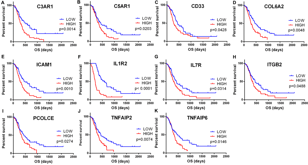 To explore the potential roles of individual DEGs in overall survival, we generated Kaplan-Meier survival curves from TCGA database. Among the 480 DEGs upregulated in the high-immune scores group, a total of 258 DEGs (Supplementary Table S2) were shown to significantly predict poor overall survival in log-rank test (p<0.05, selected genes are shown in Figure 3).