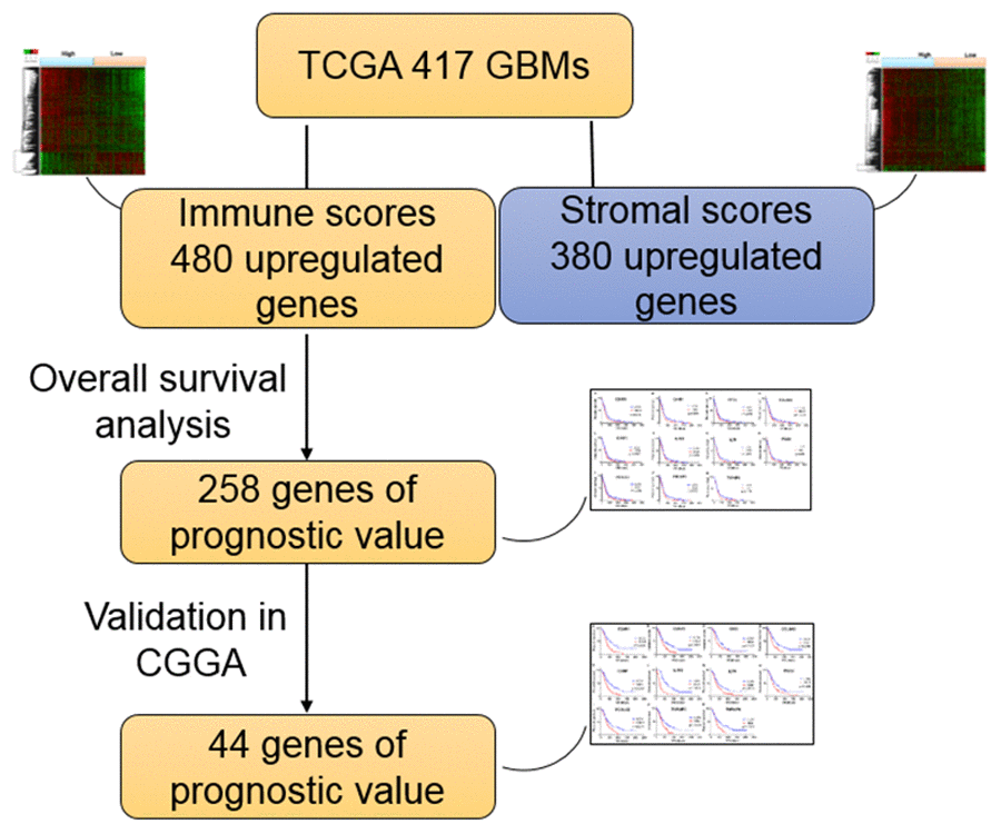 For the first time in this current work, by taking advantage of both TCGA database of GBM cohorts and ESTIMATE algorithm-derived immune scores [14], we extracted a list of microenvironment associated genes that predict poor outcomes in GBM patients. Importantly, we have validated such correlation in a different GBM cohort available from the Chinese Glioma Genome Atlas (CGGA) database.