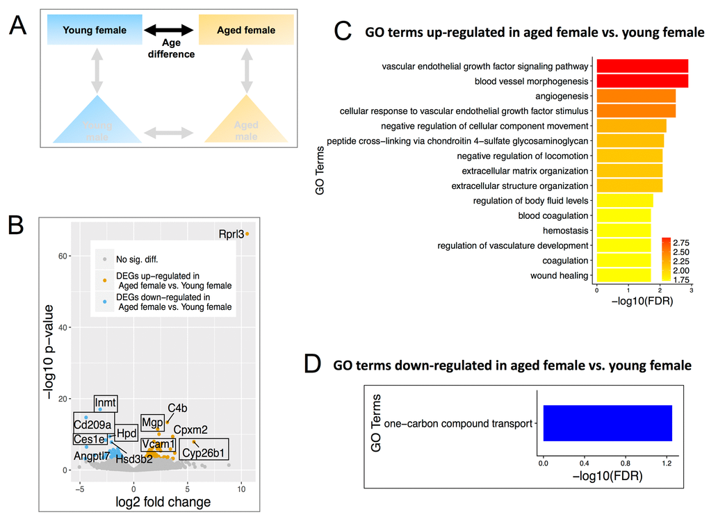Finally, there were 546 DEGs in aged females vs. males (Figure 6B, Table S5), which is 4.8-fold more DEGs than in young female vs. male (113 DEGs). Of these, 441 were up-regulated in aged females and 105 were down-regulated in aged females. When comparing aged female and aged male to one another, the major genes that increased in aged female were Insulin Like Growth Factor 2 (Igf2), Prolactin Receptor (Prlr) and Sulfatase 1 (Sulf1) (Figure 6A). Igf2 is known to regulate adult hematopoetic stem cell activity [64] and Sulf1expression decreases proliferation and migration in cancer cell lines [65]. The major genes downregulated were Angiopoietin Like 7 (Angptl7) and solute carrier organic anion transporter family, member 1a1 (Slco1a1) (Figure 6A).