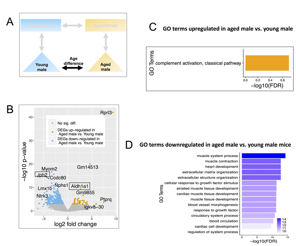 Up-regulated genes in aged males were significantly enriched in immune responses (e.g., complement 1 a, b, c, Figure 3C), while genes down-regulated were enriched for GO terms relating to muscle contraction & development (e.g. myomesin 2, myocardin, Figure 3D).
