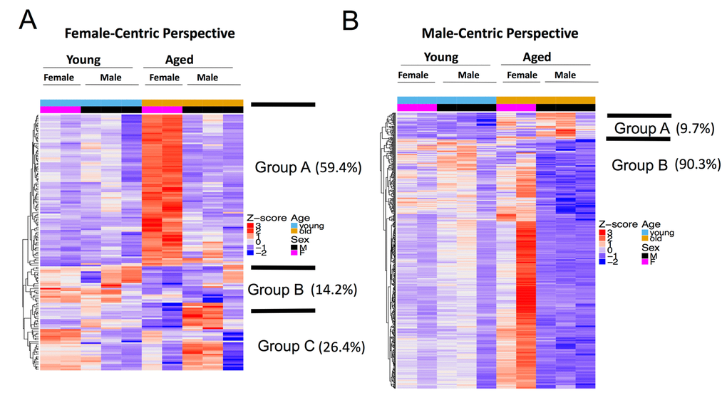 We then took a male-centric view and examined the profile of DEGs in the male aging process across all samples. Genes up-regulated in aged vs. young male are also moderately up-regulated in aged vs. young female (group A, 47 out of 487 autosomal DEGs, 9.7%, Figure 4B). However, most of the DEGs that were significantly down-regulated in aged vs. young males were up-regulated in aged female mice (440 out of 487, 90.3%, group B, Figure 4B). Perturbed pathways during the aging process are also different between female and male mice (Figure 2B, 2C, 3B and 3C). It is clear that genes perturbed in the aging process are distinct between males and females, i.e., transcriptome perturbations in the aging process exhibit sex dimorphism.