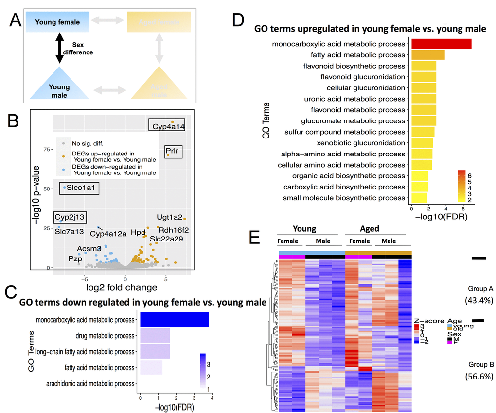 Interestingly, both the up- and down- DEGs in young female vs. young male mice were enriched for monocarboxylic acid (which includes fatty acid) and xenobiotic metabolic processes (Figure 5C and 5D). When clustered based on their expression profile across all sex and age groups, these 113 DEGs fall into two distinct categories. Sex differences in group A (49 out of 113, 43.4%) decreases with age while differences in group B (64 out of 113, 56.6%) persisted or increased with age (Figure 5E). In particular, genes expressed higher in young male compared to young female mice are expressed even higher in aged male than in aged female, consistent with these differences being even more pronounced with advanced age (Figure 5E).