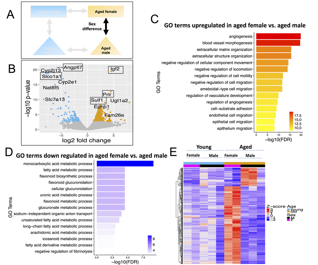 Up-regulated DEGs in aged females were enriched for angiogenesis (Figure 6C); while down-regulated DEGs in aged females (higher in aged male) were again enriched for fatty acid metabolism (Figure 6D). Only 35 genes are differentially expressed between female vs. male in both young and aged age groups. Therefore, 96% of the differentially expressed genes in aged female vs. aged male mice arise de novo in the aging process, i.e., they are not differentially expressed in young female vs. young male (Figure 6E).