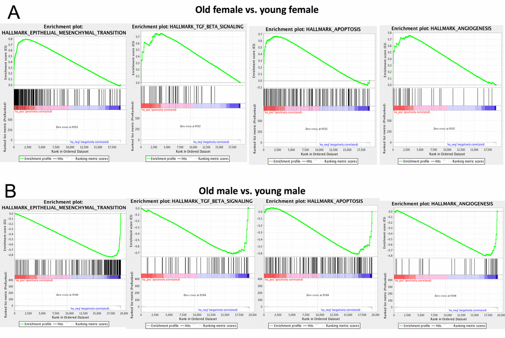 We performed Gene Set Enrichment Analysis [66] using the Hallmark gene set [67] for both aged vs. young female and aged vs. young male mice (Table S6-9). We observed that epithelial-mesenchymal transition, TGF β, apoptosis and angiogenesis pathways are significantly up-regulated in aged females compared to young females (Figure 7A). This is consistent with previous results that these pathways play important roles in CoRL aging [46,68,69]. Surprisingly, these pathways are down-regulated in aged male vs. young male (Figure 7B), further supporting that CoRL aging process is different between male and female. In particular, multiple matrix metallopeptidase genes (e.g., Mmp2, Mmp3, Mmp14) that regulate EMT [70–72] are significantly up-regulated in aged female but not aged male. Down-regulation of biglycan (Bgn) is known to inhibit cell cycle and induce apoptosis [73]. Interestingly, biglycan is significantly up-regulated in aged female but down-regulated in male.