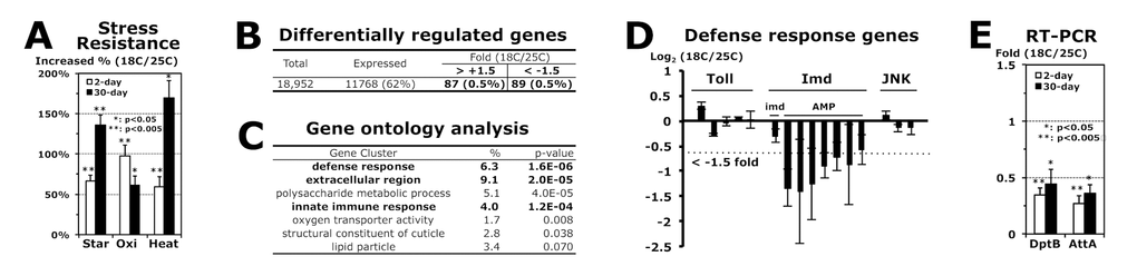 Fruit flies, which are ectothermic animals, can live more than twice as long at 18°C than at 25°C [1]. Even though it has been thought that this enhanced longevity at a lower temperature (18°C) is caused by a change of metabolic rate [2], the mechanisms that regulate longevity by ambient temperature are poorly understood. Previously, we found that development at 18°C (from embryo to newborn adult) significantly enhances stress resistance of adult flies with more accumulation of nutrients (especially fat) in the body than development at 25°C [3]. This enhanced resistance to stress was similarly observed in both sexes and sustained up to 30 days (middle age) after hatching of the adult flies [3], indicating that development at a lower temperature, 18°C, significantly enhances the mechanism(s) of stress resistance. Higher stress resistance and/or fat accumulation are frequently found in long-lived flies [4-6] such as mutants of the IGF (insulin/insulin-like growth factor) signaling pathway [7,8]. From the RT-PCR tests of representative stress-related genes, we showed that the development at a lower temperature (18°C) downregulates antimicrobial peptide genes, AttA and DptB, of the Immune deficiency (Imd) pathway [3]. The Imd pathway is known to regulate innate immune responses in Drosophila [9], and the Imd protein activates two downstream branches, JNK/basket and NF-kB/Relish, which are subsequently responsible for the upregulation of stress tolerance and antimicrobial peptide genes, respectively [10,11].