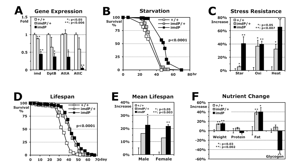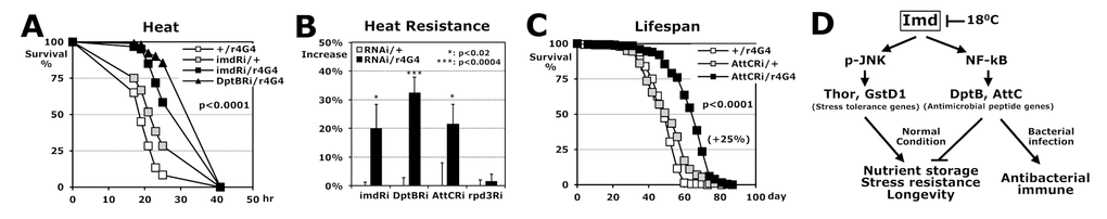 The roles of the Imd pathway have been well studied in a humoral response against intruders, which is characterized by the secretion of antimicrobial peptides (AMPs) into the hemolymph [12]. However, whether the Imd pathway is involved in a longevity mechanism has not been reported. Using hypomorphic imd and AttC mutant flies, here, we show that the mild downregulation of the Imd pathway has a beneficial effect for stress resistance with higher fat content in the body even when developed at 25°C. The Imd pathway functions for the immune response in the fat body [13] which is involved in the metabolism and storage of fat in adult flies. Surprisingly, our data show that the fat-body-specific downregulation of Imd AMP genes significantly enhances heat resistance and extends lifespan.