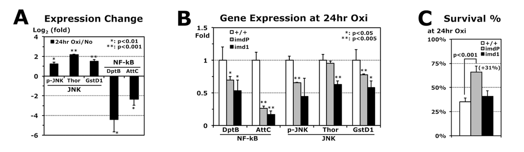 The imd1 mutant is known to be a stronger hypomorphic mutant than imdP in the immune response to E. coli infection [23]. Although the expression change of the imd gene was not shown due to the missense mutation of imd1 [24], the AMP genes in the Imd pathway were downregulated in the imd1 flies (Table 1). The heterozygous (imd1/+) flies exhibited enhanced stress resistances, higher MnSOD activity, longer lifespans, and increased fat content (Table 1), as shown in the imdP mutants (Fig. 2). However, in imd1 homozygous mutants, the stress resistance was not significantly changed under oxidation or was highly decreased when subjected to heat stress (Table 1). Another imdNP mutant, in which a P-element is inserted into the coding region of the imd gene, also showed the different phenotypes between the heterozygous and homozygous imdNP flies (Fig. S1). A possible explanation is that the JNK/basket pathway, which is activated by the Imd protein and then is subsequently responsible for upregulation of the stress response genes [10,11], is less active due to the severe loss of imd function. The JNK downstream genes, Thor and GstD1, are upregulated for stress tolerance [25]. As expected, their expressions were increased during oxidative stress (24 hours) of the wild-type flies (Fig. 3A). In contrast, AMP genes (DptB and AttC) were downregulated (Fig. 3A), which suggests that reducing Imd AMP expressions may be beneficial for stress tolerance. Compared to the wild-type flies, both imdP and imd1 mutant flies show more reduced DptB and AttC expressions after 24 hours of oxidative stress (Fig. 3B). However, the imd1 flies also showed significantly reduced expressions of Thor and GstD1 (Fig. 3B). Then, we found that the imdP flies were able to survive longer than the wild-type and imd1 flies under the oxidative stress (Fig. 3C), probably due to reduced AMP expressions, but still sustained expressions of Thor and GstD1.