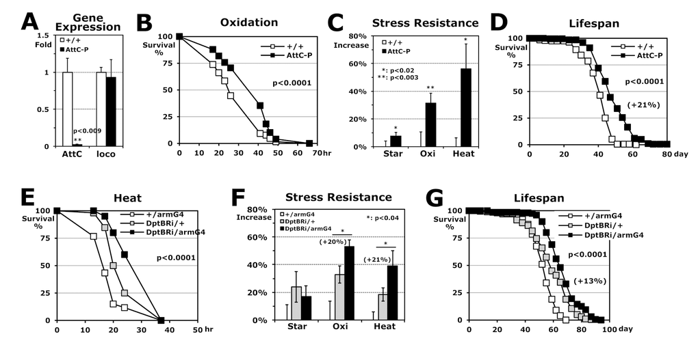 Next, to investigate if the expression changes of Imd-driven AMP genes are directly related to stress resistance and longevity, we tested AttC-P mutant flies in which AttC expression is completely removed without any change in the expression of another longevity-related gene, loco [26] (Fig. 4A). The AttC-P flies interestingly enhanced stress resistances against oxidation and heat, significantly (Fig. 4B-C), as did the imdP mutant flies (Fig. 2C). In addition, lifespan was 21% extended with the AttC downregulation (Fig. 4D). Using an UAS/Gal4 system [27], we examined the downregulation effect of another AMP gene (UAS-DptB-dsRNAi: DptBRi) with an arm-Gal4 driver that expresses a target UAS-gene in the whole body. The DptBRi/armGal4 flies also exhibited higher stress resistance (~21% increase) and longer lifespan (+13%) compared to the control DptBRi/+ flies (Fig. 4E-G), indicating that the expression levels of antimicrobial peptide genes in the Imd pathway are directly involved in the stress resistance and the longevity mechanism.