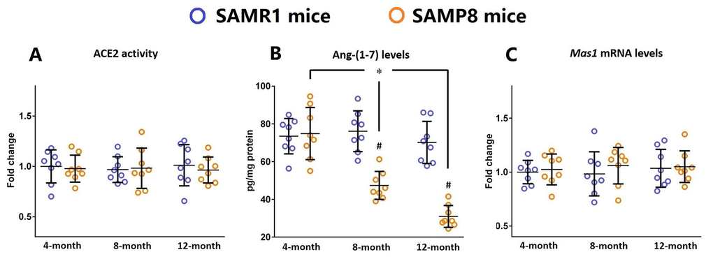 First, in this study, we showed a progressively enhanced inflammatory response in the aged brain, since the expression of inflammatory markers including IL-1β, IL-6, and TNF-α was significantly increased in SAMP8 mice brain during the aging process. These results were compatible with previous findings from our group and others that SAMP8 mice exhibited a chronic neuroinflammatory status [25,26]. Meanwhile, we demonstrated that the levels of Ang-(1-7) was significantly reduced in the aged brain, and these findings were in accordance with our previous observations in SAMP8 mice [27].