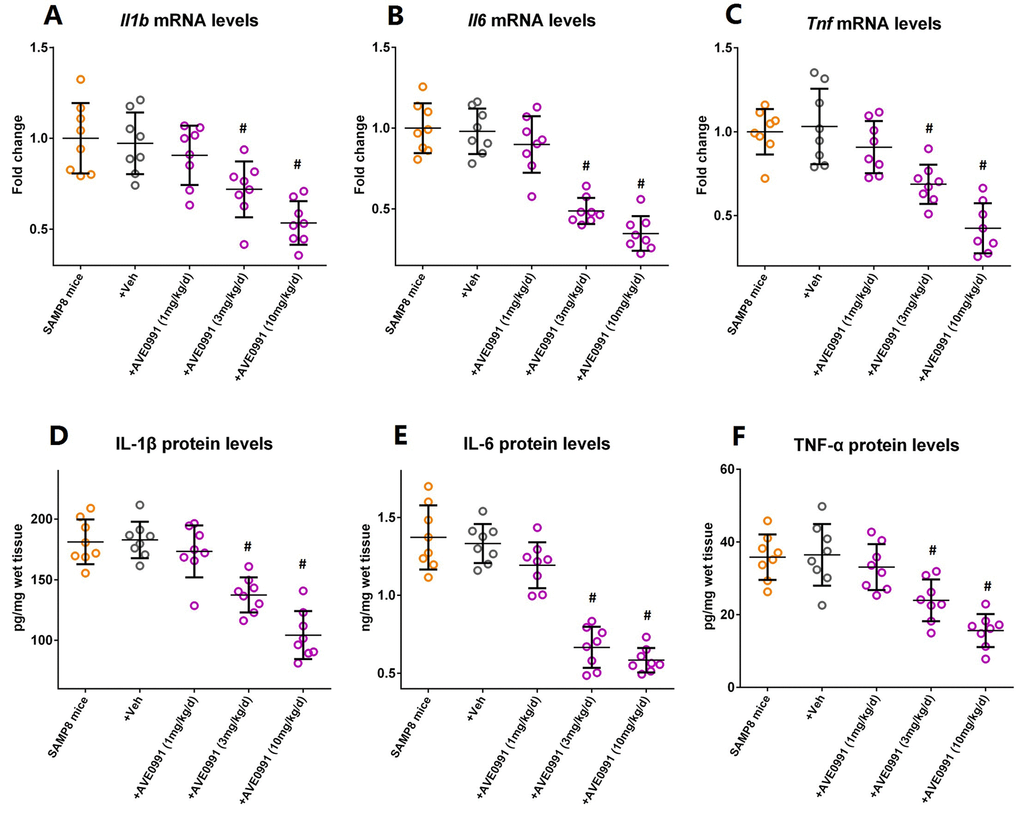 As illustrated by Supplementary Figure S1, eight-month-old SAMP8 mice were injected intraperitoneally with vehicle or AVE0991 (1, 3 or 10 mg/kg/day) once a day for 30 consecutive days. AVE0991 injection (3 or 10 mg/kg/day) significantly decreased the mRNA levels of Il1b, Il6 and Tnf in the brains of SAMP8 mice (Figure 3A-C, n=8, P<0.05). In addition, a corresponding decrease in protein levels of IL-1β, IL-6 and TNF-α in the brains of SAMP8 mice was observed following AVE0991 (3 or 10 mg/kg/day) injection (Figure 3D-F, n=8, P<0.05). It should be noted that AVE0991 (1, 3 or 10 mg/kg/day) had no significant effect on mRNA levels of Il1b, Il6 and Tnf in the brains of 8-month-old SAMR1 control mice (Preliminary experiments, Supplementary Figure S2, n=5). These findings indicated that AVE0991 attenuated neuroinflammation in the aged brain.