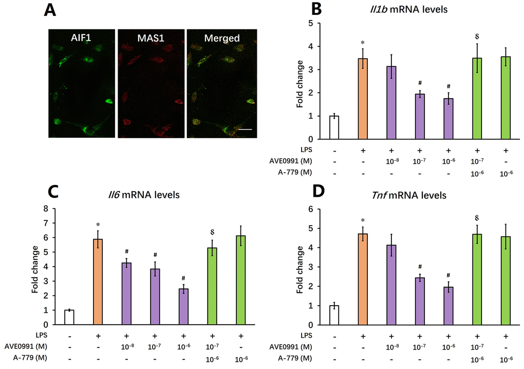 Afterwards, we tried to elucidate the underlying mechanisms by which AVE0991 attenuated neuroinflammation. As MAS1 receptor was reported to be expressed by microglia whilst activation of microglia contributed to the neuroinflammatory response during the aging process [8,23], we then speculated that AVE0991 attenuated neuroinflammation by suppressing microglial-mediated inflammatory response. To test this hypothesis, primary microglia were isolated from the brain of 8-month-old SAMP8 mice. Double immunofluorescence staining indicated a good co-localization of MAS1 with a microglial marker AIF1, confirming that MAS1 receptor is expressed by microglia (Figure 4A). Next, microglia were treated for 4 h with 100 ng/ml LPS with or without 4 h pre-incubation with AVE0991 (1×10-8, 1×10-7 or 1×10-6 M) in the presence or absence of A-779 (1×10-6 M). LPS incubation induced an inflammatory response in microglia, since the mRNA levels of Il1b, Il6 and Tnf were significantly increased (Figure 4B-D, P<0.05). Pre-incubation with AVE0991 (1×10-7 or 1×10-6 M) attenuated the LPS-induced increase in Il1b and Tnf mRNA levels (Figure 4B-D, P<0.05). Meanwhile, the increase in Il6 mRNA levels was markedly inhibited by AVE0991 (1×10-8, 1×10-7 or 1×10-6 M). It is worthy to note that the effects of AVE0991 (1×10-7 M) on the mRNA levels of Il1b, Il6 and Tnf were fully abolished by A-779 (1×10-6 M), an antagonist of MAS1 receptor (Figure 4B-D, P<0.05). In addition, A-779 (1×10-6 M) alone did not significantly influence the expression of these inflammatory markers (Figure 4B-D).
