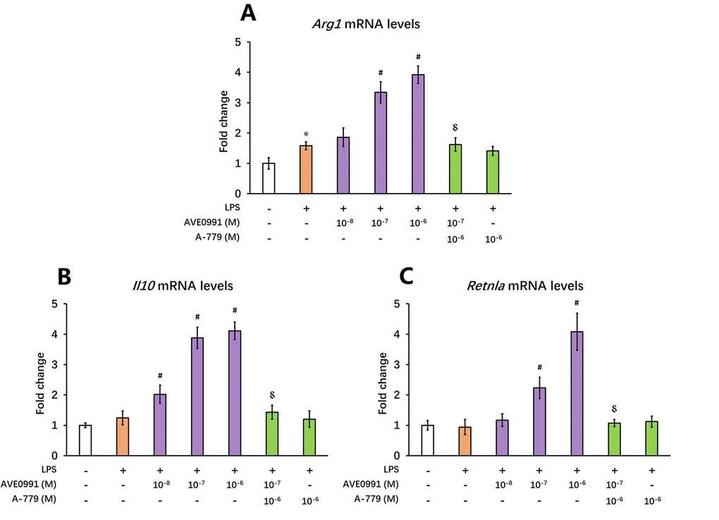 As reduced inflammatory response represents a major characteristic of M2 activation of microglia [24], we then hypothesized that AVE0991 suppressed microglial-mediated inflammatory response by switching microglia toward the M2 activation. To test this hypothesis, we measured the mRNA levels of M2 activation makers including Arg1, Il10, and Retnla in the brains of SAMP8 mice following AVE0991 treatment. Injection of AVE0991 (1, 3 or 10 mg/kg/day for 30 consecutive days) markedly increased the mRNA levels of Arg1 in the brains of SAMP8 mice (Figure 5A, P<0.05). Meanwhile, the mRNA levels of Il10 and Retnla in the brains of SAMP8 mice were significantly elevated following AVE0991 injection (3 or 10 mg/kg/day for 30 consecutive days, Figure 5B and C, P<0.05). To further validate this finding, microglia isolated from 8-month-old SAMP8 mice were treated for 4 h with 100 ng/ml LPS with or without 4 h pre-incubation with AVE0991 (1×10-8, 1×10-7 or 1×10-6 M) in the presence or absence of A-779 (1×10-6 M). As shown in Figure 6A and C, pre-incubation with AVE0991 (1×10-7 or 1×10-6 M) significantly increased the mRNA levels of Arg1 and Retnla (P<0.05). Meanwhile, the mRNA levels of Il10 were markedly elevated by AVE0991 (1×10-8, 1×10-7 or 1×10-6 M, Figure 6B, P<0.05). It should be noted that the effects of AVE0991 (1×10-7 M) on Arg1, Il10, and Retnla mRNA levels were fully reversed by A-779 (1×10-6 M, Figure 6, <0.05). Additionally, A-779 (1×10-6 M) itself did not markedly affect the expression of these M2 activation markers (Figure 6).