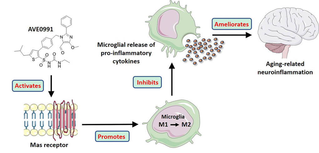 Summarily, in this study, we revealed that the neuroinflammation in the aged brain might be attributed to a decreased level of Ang-(1-7). More importantly, we provided evidence that AVE0991, a nonpeptide analogue of Ang-(1-7), attenuated the aging-related neuroinflammation via suppression of microglial-mediated inflammatory response through a MAS1 receptor-dependent manner. Meanwhile, this protective effect might be ascribed to the M2 activation of microglia induced by AVE0991 (Summarized in Figure 7). Taken together, these findings reveal the association of Ang-(1-7) with the inflammatory response in the aged brain and uncover the potential of its nonpeptide analogue AVE0991 in attenuation of aging-related neuroinflammation.