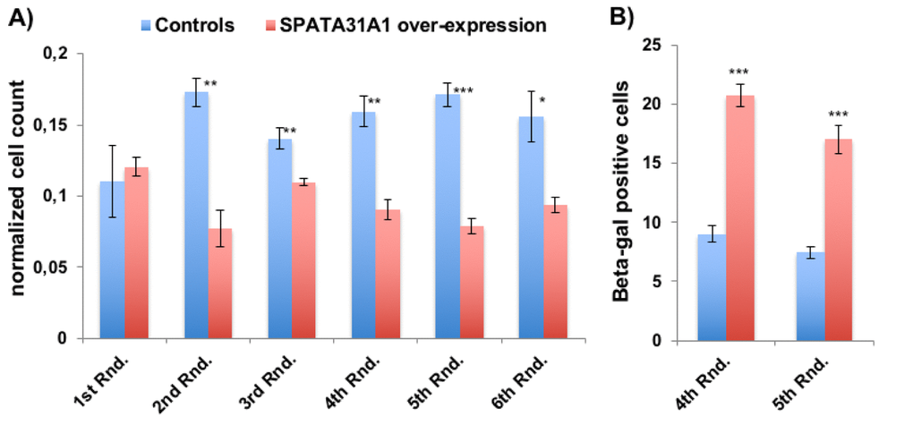 Over-expression of SPATA31A1 in primary human fibroblast (HFF) cells was achieved using a mammalian expression vector with a CMV enhancer and promoter. Normal expression of SPATA31A1 is low in these cells, while the introduction of the expression vector resulted in a 2.7 fold increase. After the initial transformation, cells were re-cultured every three weeks for up to five additional rounds. We found that SPATA31A1 over-expressing cultures produced relatively fewer cells in each of the replication rounds than the controls transformed with the vector only (Fig. 1A). Based on the ß-galactosidase staining assay for cellular senescence, we observed about twice as many senescent cells in the SPATA31A1 over-expressing cultures than in the controls (Fig. 1B).