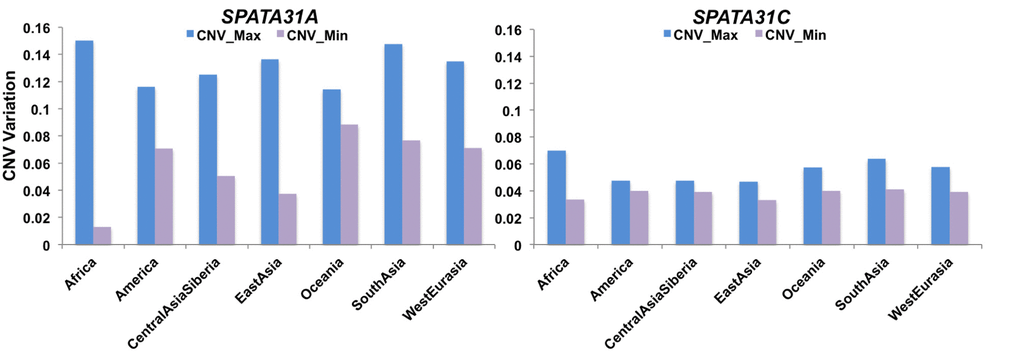 These results raise the question whether natural expression differences of SPATA31 genes through copy number variation could influence mutational and aging processes in humans, especially since humans have the relatively highest number of SPATA31 gene copies among primates [6]. To obtain an overall pattern of copy number variation in humans, we analyzed the Simons Genome Project (SDGP) [26] data using a read depth approach. Given the differences between the SPATA31 A- and C-types (see introduction), we analyzed them separately. We found that SPATA31A has more copies and is more copy number variable than SPATA31C (Fig. 2), with the largest copy number differences seen for SPATA31A in the African populations. When summed across all SPATA31 copies, averages and variances are similar between the population groups, with the exception of native Americans and Africans having lower averages and Africans also higher variance (Suppl. Figure S4). Given that higher copy numbers are expected to express also more gene product, we use in the following correlations with copy numbers to assess effects of SPATA31 in humans.