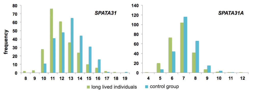 We determined SPATA31 copy numbers in two separate sample sets, in two independent runs. The first included DNA samples from 155 long-lived individuals (LLI - aged at least 96 years at the time of recruitment) and 163 samples of younger controls (60-75 years) from the same population cohort. The second included 96 samples from each of these groups. A detailed description of the study participants and the recruitment procedure is provided in [29] and [28]. Further, we used two different primer sets for each run, the first amplifying both, SPATA31A and SPATA31C variants, the second specific for SPATA31A variants.