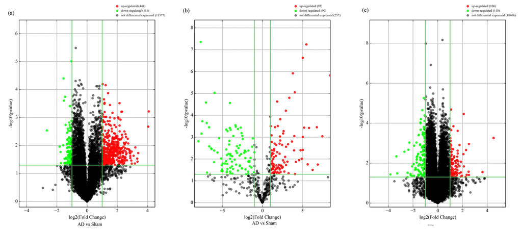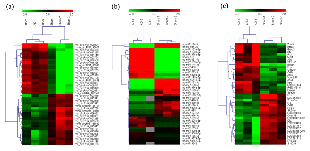 There are certain limitations to our study which should be considered when interpreting our findings. Firstly, the sample size was limited, which could have resulted in under- or over-estimation of the numbers of altered circRNAs, miRNAs, and mRNAs. Larger sample sizes are needed to confirm our findings. Secondly, our results refer only to hippocampal samples from Aβ1-42-induced AD rats. Further research with other AD models, using additional sample sources such as blood and cerebrospinal fluid, is now needed to more accurately capture the pathophysiology of AD. Thirdly, our analyses were performed using gene expression microarrays with limited dynamic range that lack the ability to identify novel features. RNA-sequence technology should be utilized to unravel previously inaccessible transcriptome complexities. Finally, because the functions of circRNAs and miRNAs remain largely unknown, the interpretation of our data was not straightforward. Thus, we only predicted the functions of differentially-expressed mRNAs. Future studies that overcome such limitations are now highly warranted.
