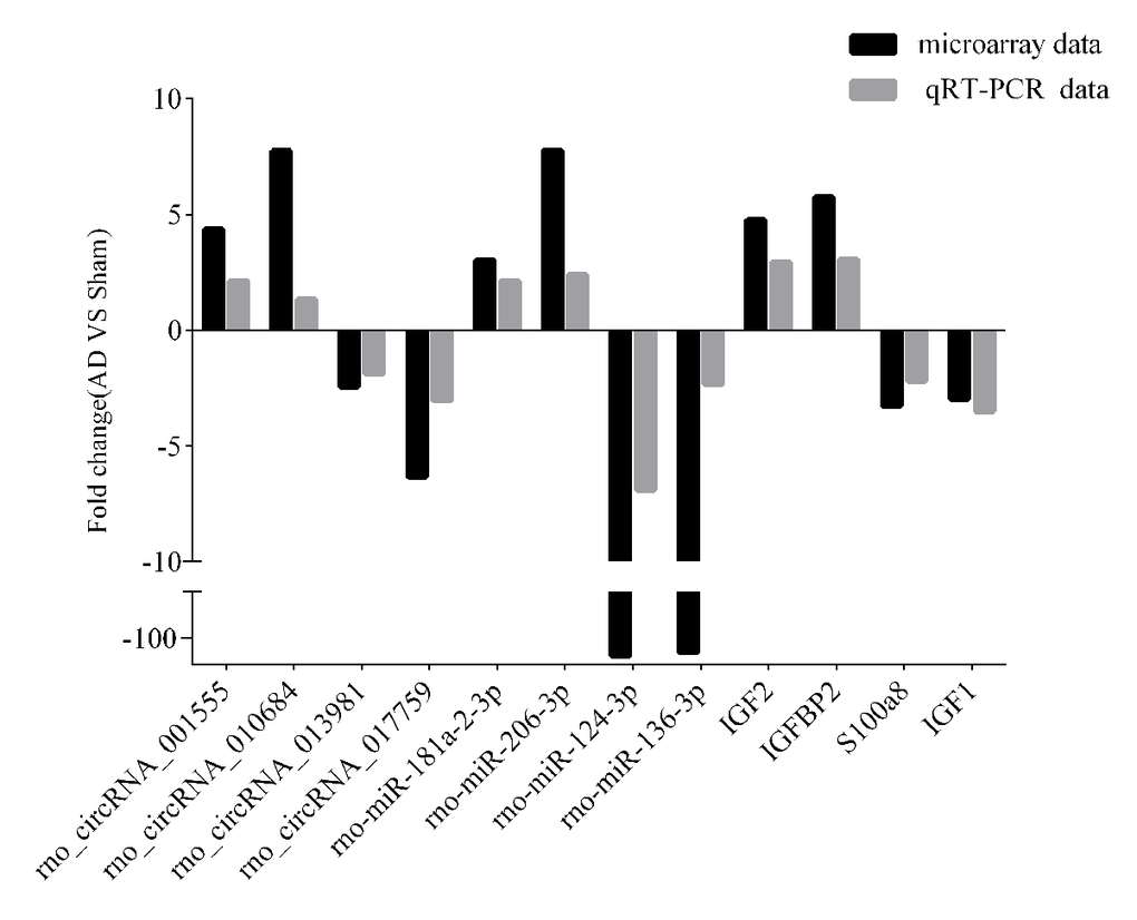 To validate the accuracy and reliability of the microarray profiling data, some transcripts, including four circRNAs (rno_circRNA_001555, rno_circRNA_010684, rno_circRNA_01398, and rno_circRNA_017759), four miRNAs (rno-miR-181a-2-3p, rno-miR-124-3p, rno-miR-136-3p, and rno-miR-206-3p), and four mRNAs (IGF2, IGFBP2, S100a8, and IGF1) were randomly selected for quantitative real-time polymerase chain reaction (qRT-PCR) analysis in nine samples including those used for microarray analysis. As shown in Fig. 3, the microarray data were consistent with the qRT-PCR results in terms of the expression levels of the validated ncRNAs and mRNAs.