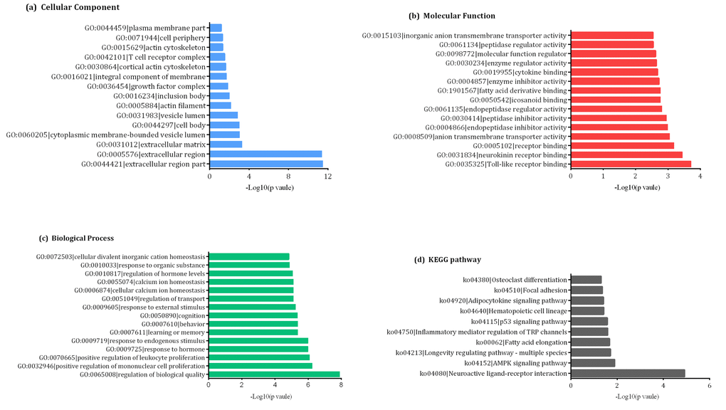 GO and KEGG pathway analyses allow for the functional annotation of differentially-expressed mRNAs. GO analysis indicated that the most enriched mRNAs correlated with the extracellular region part (GO: 0044421) of the cellular component analysis (Figure 4a). Meanwhile, the majority of genes were related to toll-like receptor binding (GO:0035325) in the molecular functions and regulation of biological quality (GO:0065008) aspect of the biological processes analyses (Figure 4b and 4c). KEGG pathway analysis indicated that 10 KEGG pathways (p < 0.05) were associated with dysregulated mRNAs involved in neuroactive ligand-receptor interaction, AMP-activated protein kinase (AMPK) signaling pathway, longevity regulating pathway-multiple species, fatty acid elongation, inflammatory mediator regulation of transient receptor potential (TRP) channels, p53 signaling pathway, hematopoietic cell lineage, adipocytokine signaling pathway, focal adhesion and osteoclast differentiation (Figure 4d).