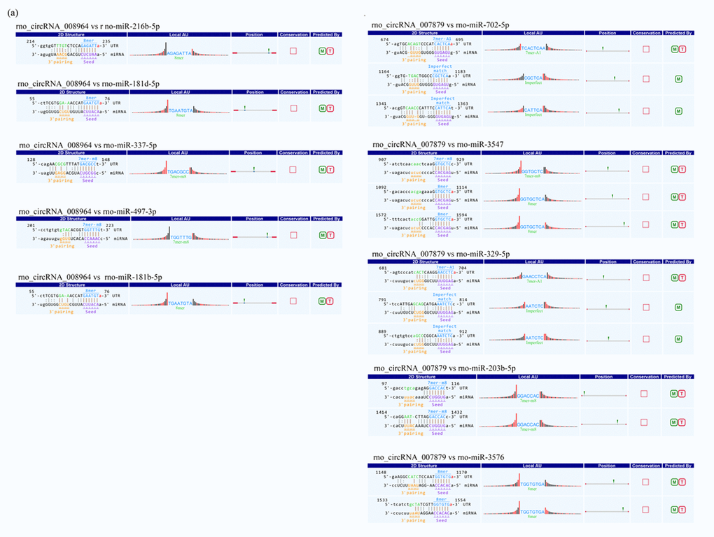 To determine the function of circRNA, interactions between circRNAs and their target miRNAs were theoretically predicted by conserved seed-matching sequences. To find the potential miRNA target, two confirmed circRNAs (rno_circRNA_008964 and rno_circRNA_017759) were selected, and circRNA-miRNA interaction was predicted using Arraystar's miRNA target prediction software based on the TargetScan and miRanda databases. The potential miRNA targets of rno_circRNA_008964 included rno-miR-216b-5p, rno-miR-181d-5p, rno-miR-337-5p, rno-miR-497-3p, and rno-miR-181b-5p (Fig. 5a). For rno_circRNA_007879, the potential miRNA targets included rno-miR-702-5p, rno-miR-3547, rno-miR-329-5p, rno-miR-203b-5p and rno-miR-3576 (Fig. 5).