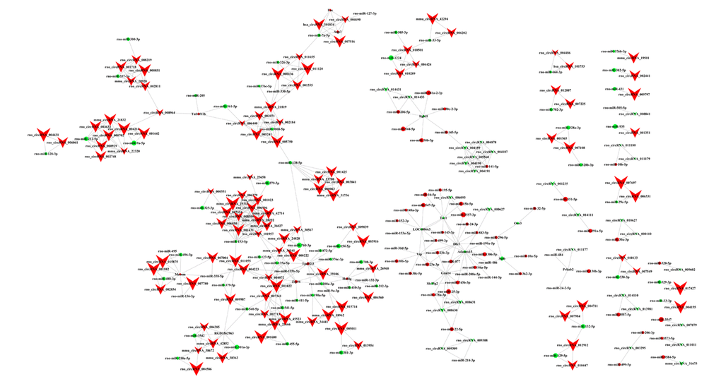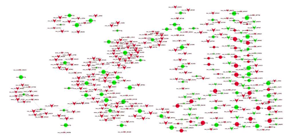 As described previously [40,41], circRNA-miRNA interactions were predicted with Arraystar's home-made miRNA target prediction software based on TargetScan (http://www.targetscan.org/) and miRanda (http://microrna.org/). The top five putative target miRNAs were identified. Then, we constructed a circRNA-miRNA regulatory network using the Cytoscape software V3.5.0 (San Diego, CA, USA).