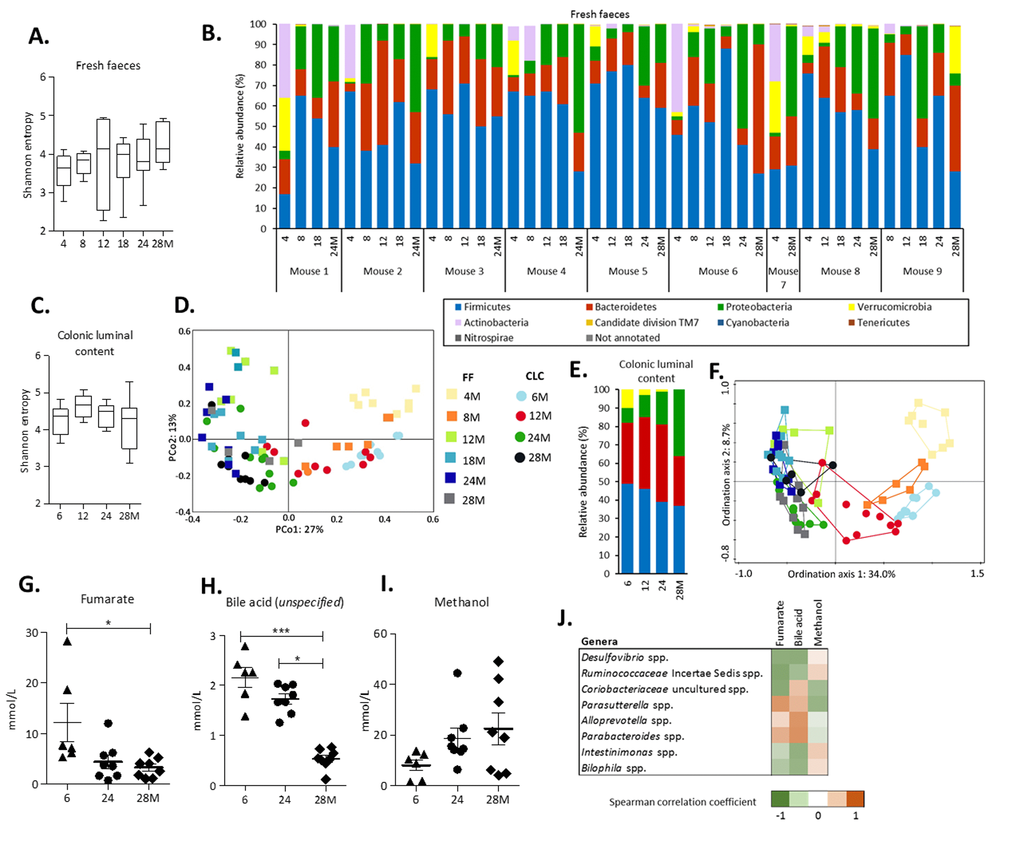| Number of mice: Fresh faeces 4M: n=8; 8M: n=6; 12M: n=7; 18M: n=8; 24M: n=8; 28M: n=5. Colonic luminal content 6M: n=10; 12M: n=10; 24M: n=10; 28M: n=10. | |||||||||||||||||||||||||||||||||||||||||||||||||||||||||||||||||||||||||||||||||||||||||||||||||||