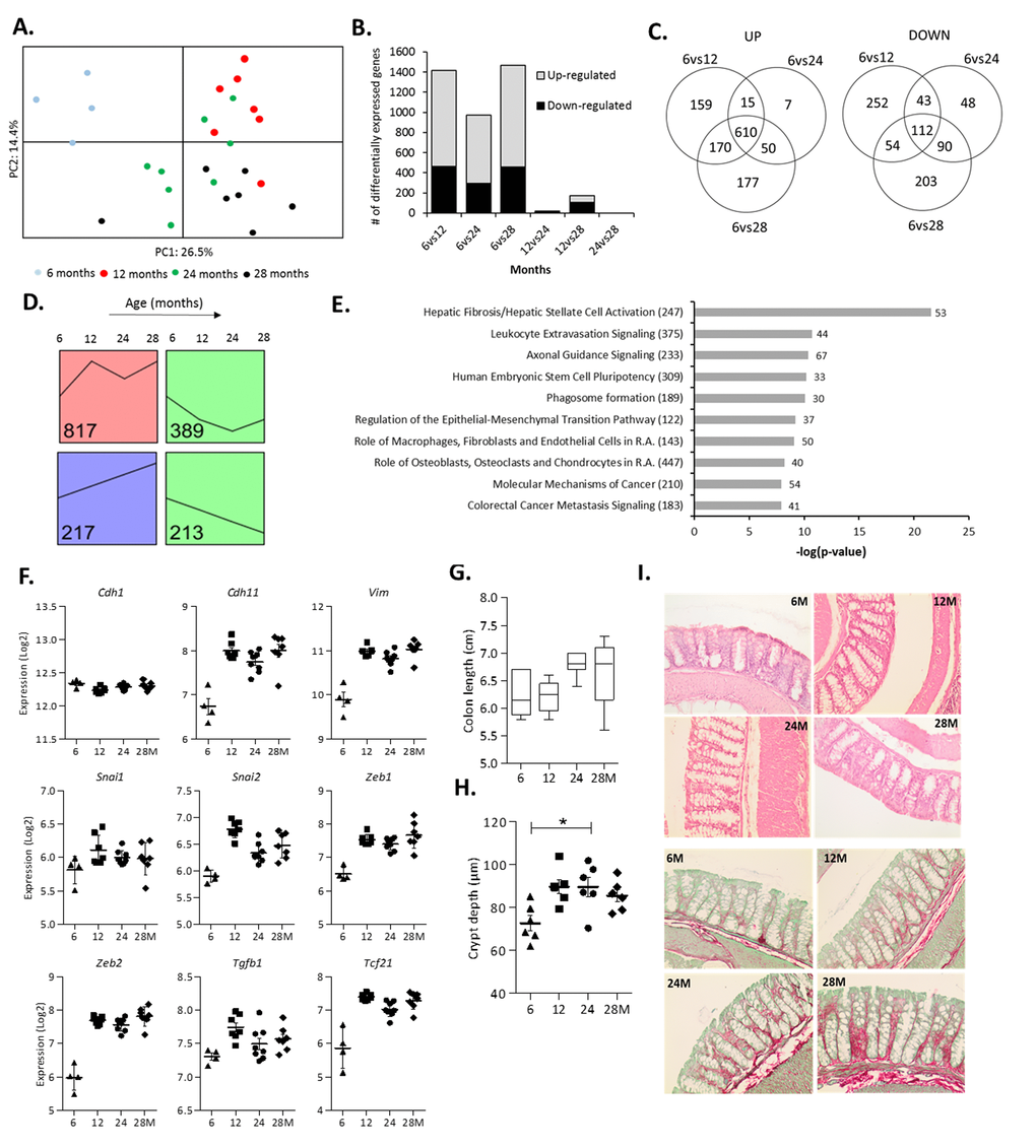 To study the potential morphological consequences of the observed changes in ECM- and EMT-related genes we measured the colon length at sacrifice as well as colonic crypt depths in H&E-stained Swiss rolls. The obtained results revealed an increase in colon length during aging (Figure 2G). A marked deepening of the crypts between 6 and 12 months of age was observed, which minimally increased afterwards (Figure 2H). Furthermore, Sirius Red/Fast Green staining of the same Swiss rolls showed that the ECM protein collagen gradually increased with age (Figure 2I).