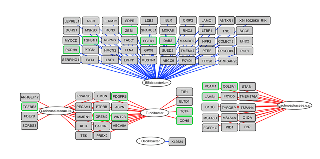 To obtain insight into the correlations between differential gene expression during the early phase of aging and the colonic microbiota composition, an integrative analysis was performed based on data of the individual mice. The 50 genera with a relative abundance of more than 0.1% in at least one sample and the 817 genes identified by STEM (Figure 2D, red cluster) showed several strong (r<-0.80 or r>0.80) positive and negative correlations (top 25 strongest correlations shown in Figure 3). Bifidobacterium spp. was negatively correlated with 228 genes, including a cluster of EMT- and ECM-associated genes, e.g. Cdh11, Fn1, Zeb1, Zeb2, Vim,Vtn and Fgfr1, amongst others (Figure 3 and Data set S3). Additionally, Turicibacter spp. and an uncultured member of the Lachnospiraceae family were positively correlated with a large number of genes, including Platelet Derived Growth Factor Receptor Beta (Pdgfrb), Wnt Family Member 2B (Wnt2b) and Gremlin 2 (Grem2), amongst others. Together, these results might imply the potential role of gut microbiota in the regulation of ECM (re)organization and EMT, or vice versa.