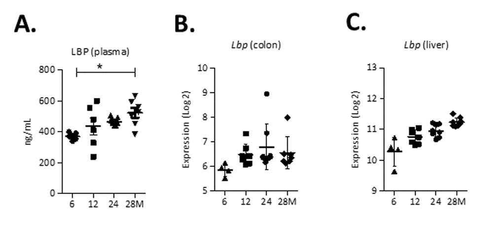 We found a strong increased relative abundance of Desulfovibrio spp. and Bilophila spp., two closely related genera that produce the potentially toxic compound hydrogen sulfide [26]. It was previously shown that the relative abundance of Desulfovibrio spp. was increased in elderly humans compared to younger subjects [14]. Furthermore, increased abundance of both Bilophila spp. and Desulfovibrio spp. has been associated with mucosal inflammation [26,27], highlighting the presumable negative physiological consequences of an enrichment of these genera in the aged population. The increased relative abundance of these members of the gram-negative Proteobacteria could explain the significantly elevated plasma LBP levels at 28 months. LBP is an acute-phase protein that binds to LPS, resulting in an innate immune response [28]. We suggest that the shift in gut microbiota composition during aging eventually caused a diminished intestinal barrier function that favored the translocation of LPS into the systemic circulation. We also found a higher relative abundance of Odoribacter spp. and Turicibacter spp. at higher age. These genera may be involved in colon tumorigenesis, since they were previously found to be enriched in tumor-bearing mice [29]. Additionally, Odoribacter spp. was recently found to have a higher relative abundance in old compared to young mice [30]. Turicibacter spp. was less abundant in humans with Alzheimer Disease compared to non-demented participants [31].