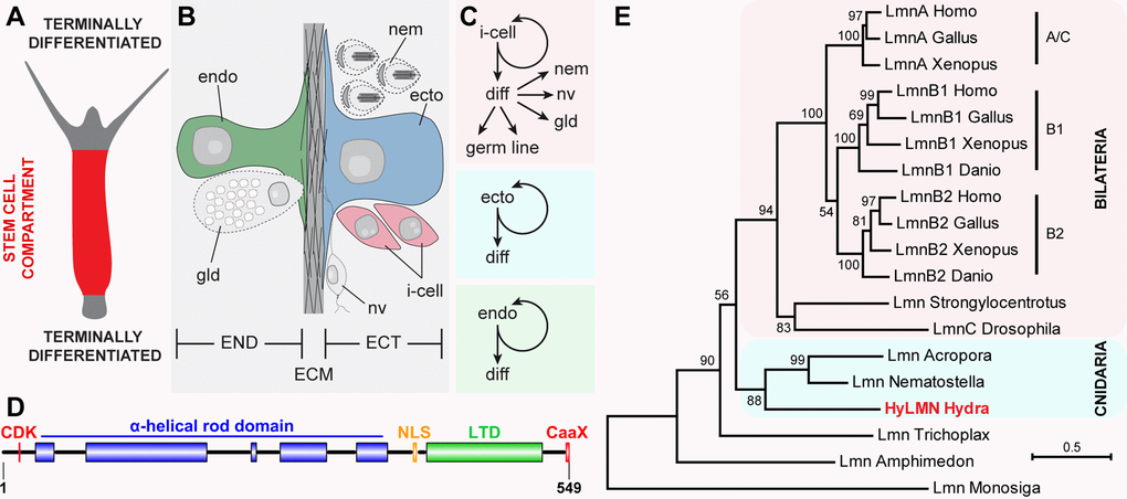 A homologue of vertebrate lamin B genes has been identified in Hydra [32], yet no efforts have been reported addressing the role of Lamin in cnidarian longevity. Here we present detailed analysis of the single Hydra lamin gene (hyLMN), its expression pattern, and distribution and function of its protein product (HyLMN). We show that Hydra stem cell proliferation displays an extraordinary robustness against the Lamin disturbance. This may play a critical role in the unlimited self-renewal capacity of Hydra stem cells and its non-senescence.