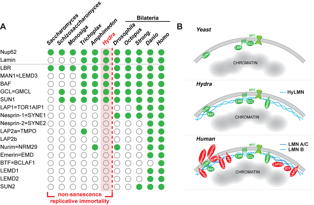 We hypothesize further, that fundamental differences in the repertoire of proteins interacting with Lamins and mediating their functions, known as lamin-binding proteins, might account for the extraordinary independence of Hydra stem-cell activity from the nuclear envelope architecture. Our analysis revealed that, in contrast to bilaterian organisms, and in particular to vertebrates and humans, the repertoire of genes coding for putative lamin-binding proteins is very much restricted in Hydra and other cnidarians, sponges and placozoans (Fig. 11A). The nuclear lamina complexity in early-branching metazoans is strikingly similar to that of the unicellular organisms, where only few lamin-binding proteins are present [56]. Interestingly, similarly to the pre-bilaterians, unicellular organisms are known for their replicative immortality [57–59]. We suggest that the fundamental difference in the nuclear envelope architecture and function may explain why in pre-bilaterian animals (e.g. sponges and cnidarians) stem cells display an everlasting activity, enabling non-senescence and extreme longevity of these animals (Fig. 11A, B). In Bilateria, on the contrast, the increasing complexity of the lamina (increasing number of Lamin proteins, expanding diversity of lamin-binding proteins) may underlie their nuclei “fragility” and strong dependence of the replicative function on the lamina. This, in turn, predisposes cells to a replicative senescence and ultimately - to a restricted lifespan.