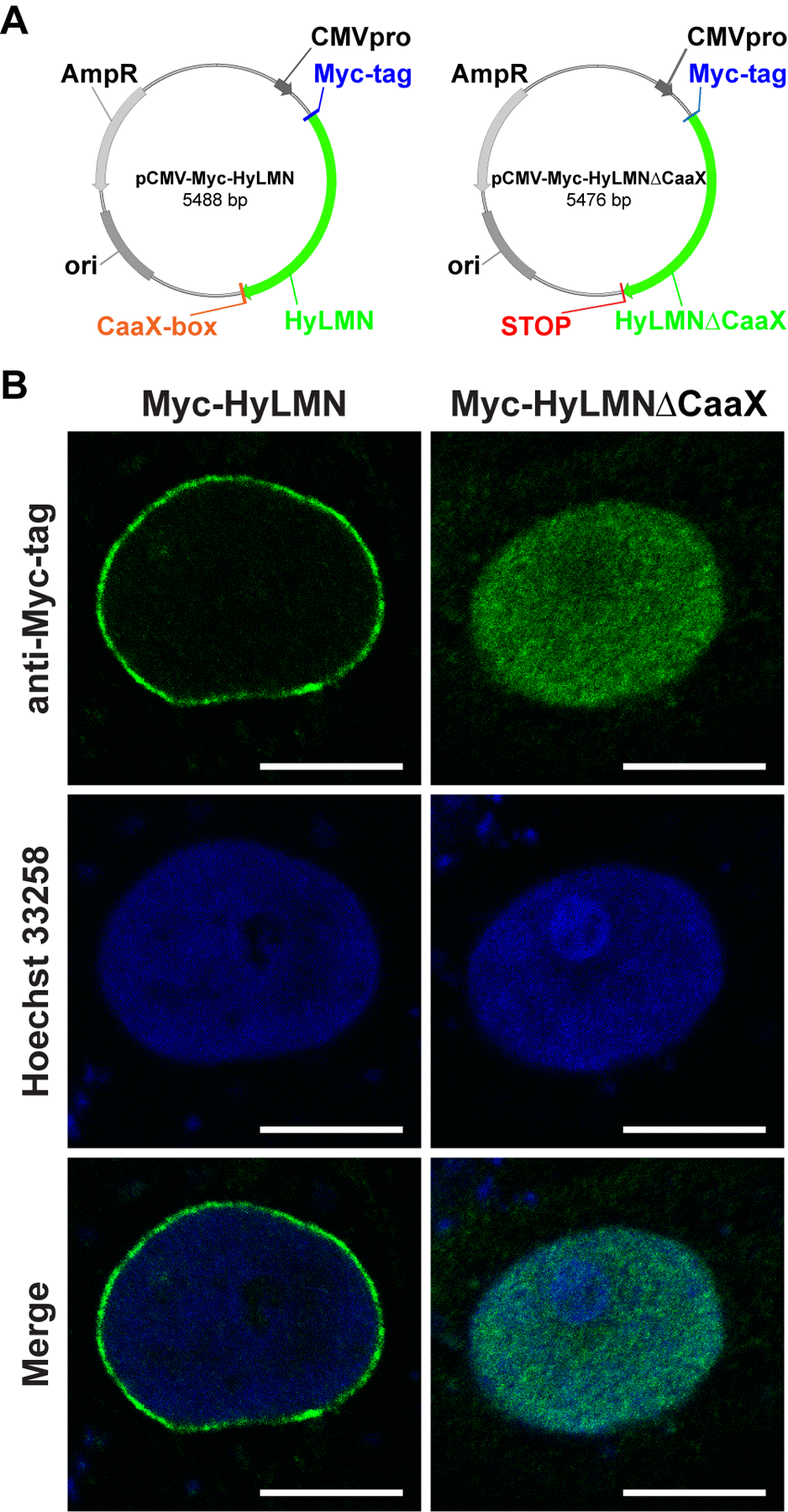 A fibroblast-like COS-7 (ATTC CRL1651) cell line derived from monkey kidney was used for heterologous expression of HyLMN. A full-length coding sequence of hyLMN was cloned into the pCMV-Myc vector (Clontech) to result in an N-terminally Myc-tagged fusion protein. To overexpress a truncated version of HyLMN (Myc-HyLMNΔCaaX), a stop-codon was introduced before the nucleotides coding for CaaX-motif. COS-7 cells were cultured in DMEM-Medium (Sigma) at 37°C und 5% CO2, transfected using Magnet Assisted Transfection (IBA Lifesciences, Goettingen, Germany), and analyzed 24 h after the transformation using immunofluorescence. Briefly, the cells grown on cover slips were fixed in 1% formaldehyde in PBS and permeabilized by 0.1% Triton supplemented PBS, and stained for 30 min with rabbit polyclonal anti-Myc antibody (1:200, Millipore) in PBT. Further, the slides were stained with AlexaFluor488-conjugated goat-anti-rabbit antibodies (1:100, Invitrogen), counter-stained with Hoechst 33258 (Sigma) and scanned using TCS-SP2 laser scanning confocal microscope (Leica).