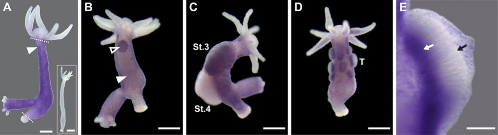 Expression pattern of the hyLMN gene was detected in the whole mount Hydra preparations by in situ hybridization with an anti-sense digoxigenin (DIG) -labeled RNA probe [68]. DIG-labeled sense-probe was used as a control. Signal was developed using anti-DIG antibodies conjugated to alkaline phosphatase (1:2000, Roche) and NBT/BCIP staining solution (Roche). Images of the in situ preparations were collected on a Zeiss Axioscope microscope with Axiocam camera.