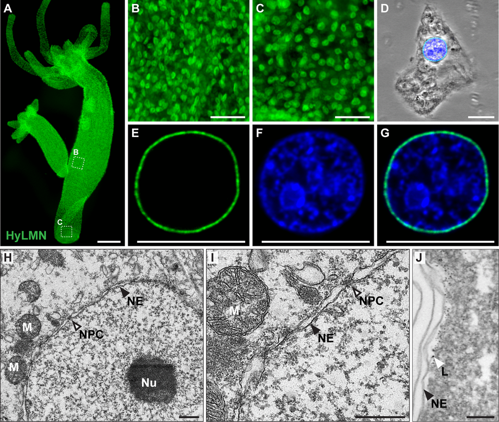 To reveal the structure of the nuclear envelope in Hydra cells, we performed electron microscopy analysis as previously described [67]. Briefly, the polyps were fixed with 2,5% glutaraldehyde solution, treated further with 2% osmium tetroxide and embedded into Epon 812. Further transmission electron microscopy analysis revealed good preservation of the cellular structures (Fig. 4H, I). However, effort to localize further the HyLMN using specific antibodies fail, most likely due to epitope damage caused by the glutaraldehyde fixation. Therefore, we used further the “pre-embedding protocol” [67] with immunogold labeling. Briefly, cryosections of Hydra polyps were fixed with 2% formaldehyde and treated consequently with primary anti-HyLMN antibodies and secondary anti-rabbit antibodies conjugated to 6 nm gold particles. The samples were further fixed with 2,5% glutaraldehyde solution, treated with 2% osmium tetroxide and embedded into Epon 812. This procedure resulted in sufficient epitope preservation, and a deposition of gold particles was specifically restricted to the inner surface of the nuclear envelope (Fig. 4J). In this case, however, the morphology of the cells was impaired, and therefore, the method was not used further for transgenic phenotype characterization.