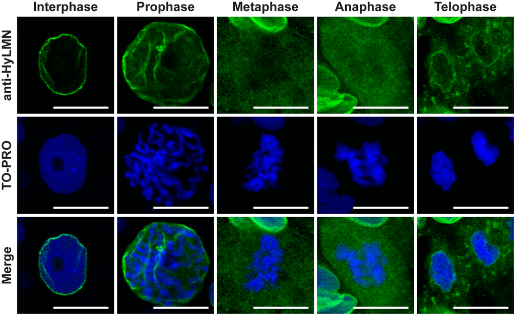 Immunochemical staining revealed, furthermore, a dynamic distribution of HyLMN in the cell along the cell cycle. In an interphase nucleus, HyLMN is localized to the inner site of the nuclear envelope and surrounds the chromatin (Fig. 4D–G, Fig.5, Suppl. Fig. 2). Consistently with these observations, immunogold staining revealed localization of HyLMN in the nucleus, in a close proximity to the inner membrane of the nuclear envelope (Fig. 4H–J). In the prophase of mitosis the nuclear lamina is fragmented, and most of the HyLMN protein is redistributed to the cytoplasmic pool in the metaphase and anaphase (Fig. 5). Finally, in the telophase the nuclear laminas of the daughter cells are assembled again (Fig. 5). This dynamic HyLMN distribution is observed in proliferating cells of all three Hydra stem cell lineages. Together, localization of HyLMN protein to the nuclear envelope and its dynamic distribution in Hydra cells on different cell cycle stages reflect the behavior reported for Lamin proteins in invertebrates and vertebrates [37], highlighting functional conservation of the protein.