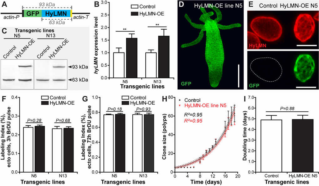 To address the function of the HyLMN protein in Hydra, we implemented transgenesis technology [5], and first overexpressed the entire HyLMN coding sequence fused to GFP under a ubiquitous promotor (Fig. 6A). Two transgenic lines (N5 and N13) revealed 1.5-fold up-regulation of hyLMN mRNA expression (Fig. 6B) in total polyps compared to the corresponding controls (so called “empty” polyps). However, since in the both strains the transgene was integrated only into the ectodermal cell lineage, while cells of other two (endodermal and interstitial) lineages remained intact, the up-regulation level in the transgenic cell lineage is likely even higher, about 5-fold. Western-blot analysis confirmed successful expression of the fusion protein. In addition to a band of a molecular weight of 63 kDa present in protein extracts from both, control and transgenic Hydras, and corresponding to the endogenous HyLMN protein, a band with an apparent molecular weight of 93 kDa was detected in the transgenic polyps (Fig. 6C). This size corresponds to the expected molecular weight predicted by summing up the size of HyLMN (63 kDa, Suppl. Fig. 1) and GFP (30 kDa, Fig. 6A). These observations also provide an additional evidence for the high specificity of the anti-HyLMN antibody. Overexpressed fusion protein is present in all ectodermal cells of transgenic polyps (Fig. 6D) and localized to the nuclear envelope, as anticipated since the C-terminal CaaX-box is present and not affected by fusion to GFP. Remarkably uneven distribution of HyLMN in the nuclear lamina is detected in the transgenic cells compared to the controls (Fig. 6E and Suppl. Video 1): the nuclear lamina acquires a fenestrated, basket-like appearance in the transgenic cells. This abnormal structure of the nuclear lamina, however, does not affect the mitotic activity of the Hydra stem cells. Surprisingly, no difference in the BrDU-incorporation index is detected after 3 h and 72 h incubation in BrDU, indicating that neither the cell cycle length, nor the proportion of proliferating cells are affected (Fig. 6F, G). In accordance with these observations, clonal growth of the transgenic polyps is not affected, and the transgenic polyps have a population doubling time equal to that of the control polyps (Fig. 6H, I). No developmental abnormalities were detected in the transgenic polyps, and transgenic lines are maintained in the lab over 3 years. Together these data indicate that overexpression of HyLMN does not compromise stem cell proliferation and non-senescence in Hydra.