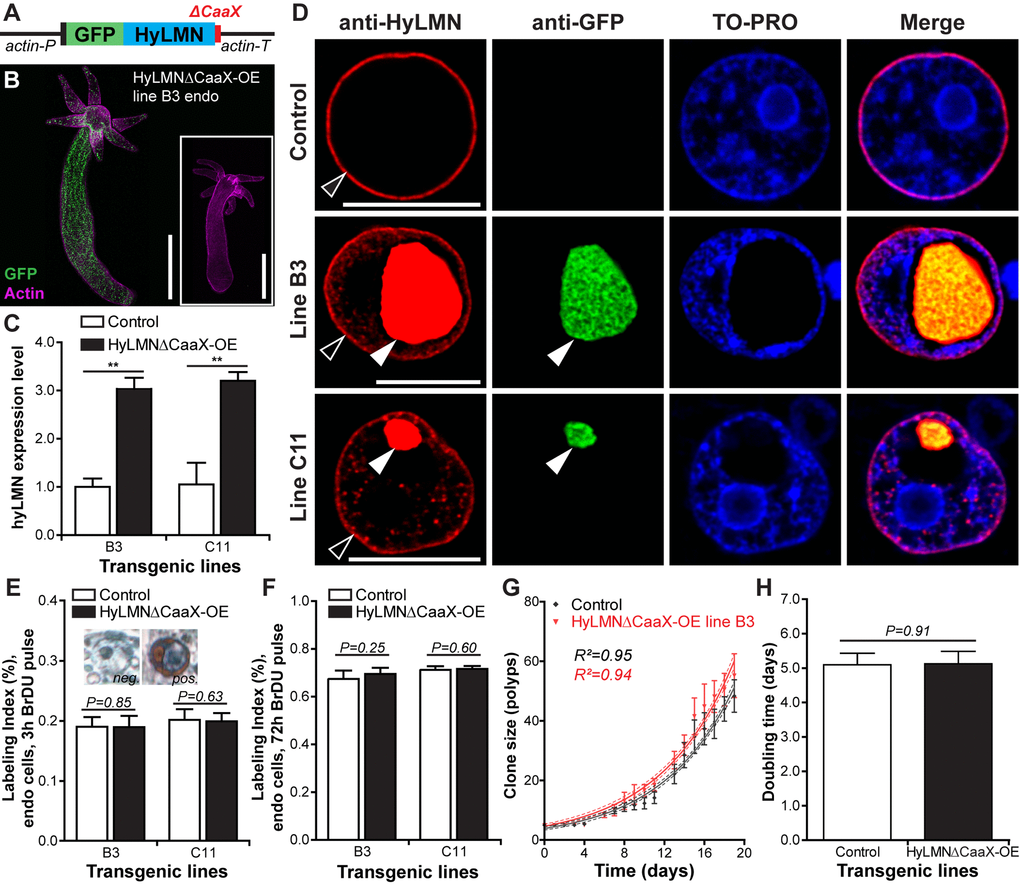 Further we overexpressed a mutated version of HyLMN fused to GFP, where a stop-codon was inserted into the hyLMN coding sequence upstream from the codons for CaaX-motif (Fig. 7A), resulting in a truncated Lamin version (HyLMNΔCaaX). Two transgenic lines (B3 and C11) expressing the construct in the endodermal cells were obtained (Fig. 7B, C), and a 3-fold upregulation of hyLMN expression was achieved (Fig. 7C). Strikingly uneven distribution of the mutated HyLMNΔCaaX was observed in the both transgenic lines (Fig. 7D). The fusion protein is accumulated in the nucleoplasm, forms small speckles and giant granules that displace the chromatin to the nuclear periphery (Fig. 7D). As anticipated, in the absence of CaaX-motif the fusion protein is not able to be integrated in the nuclear envelope resulting in an absence of any GFP signal in the rim around the chromatin (Fig. 7D). This indicates that the nuclear lamina of the transgenic cells is made of only the endogenous non-mutated Lamin. A BrDU-incorporation analysis revealed that the transgenic cells are able to undergo cell cycle and incorporate BrDU (Fig. 7E) in spite of dramatic accumulation of Lamin in the nucleoplasm. Surprisingly, no change in proliferative activity of epithelial cells is detected after 3 h and 72 h of BrDU labeling (Fig. 7E, F). Similarly to the overexpression of a normal HyLMN (Fig. 6H, I), the clonal growth of transgenic animals with a mutated HyLMNΔCaaX is not affected (Fig. 7G), and the growth rates are equal to those of the control polyps (Fig. 7H). Taken together, our data indicate that the stem cell activity is robust against overexpression and major mislocalization of the HyLMN protein.