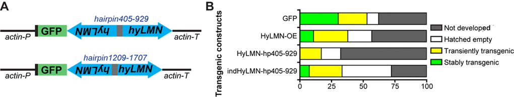 To overexpress HyLMN protein, the coding region of hyLMN was cloned into the LigAF vector [5] in-frame and downstream from the sequence of an enhanced green fluorescent protein (eGFP). The transgenic cassette was therefore driven by the actin promoter sequence and flanked by the actin terminator from the 3’-end. To overexpress a truncated version of HyLMN lacking CaaX-motif (HyLMNΔCaaX), a stop-codon was introduced into the hyLMN CDS upstream adjacent to the codons coding for CaaX-box. To induce shRNA-mediated knock-down of hyLMN, two hairpin cassettes were designed based on previously reported principles [38]. Briefly, each hairpin contained a sequence of about 500 bp in sense and antisense orientation, separated by a short (300 bp) non-complementary spacer region (Fig. 8A). After the assembly, the hairpin cassette was cloned behind the eGFP CDS into the LigAF vector [5] (Fig. 8A), or into the backbone of the inducible system (indGFP-OE, Fig. 9A, 10A). All constructs were propagated in the E. coli DH5-alpha strain and microinjected into fertilized embryos of H. vulgaris strain AEP as previously described [5]. To compare the transgenesis efficiency, LigAF vector containing only GFP cassette was injected. Initial founder mosaic transgenic animals were screened and enriched for transgenic cells until all cells of a given lineage were transgenic. For each transgenic line a corresponding control line (so called “empty”) was obtained by screening and depleting an initially mosaic polyp until no transgenic cells were detected. Transgenic and “empty” polyps were expanded into mass cultures by clonal propagation by budding and used in further experiments.