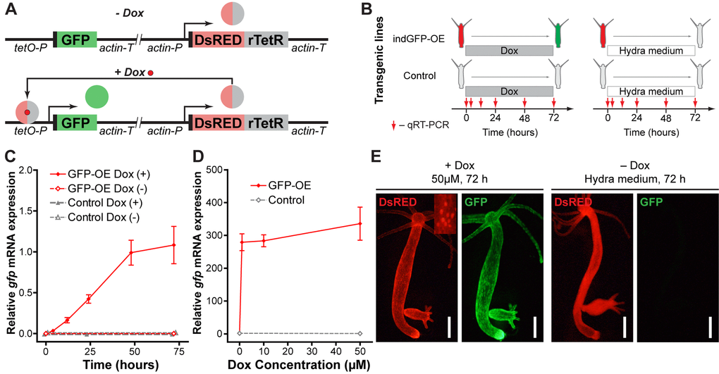 First, we validated the system by expressing the fluorescent protein GFP alone (Fig. 9). In the absence of the inducer only the red signal (DsRED) concentrated in the nuclei was detected in the transgenic polyps. Twenty-four hours after addition of Dox visible green signal appeared, and became more intensive in the following 48 hours (Fig. 9E). In agreement with that, quantification of the gfp expression by qRT-PCR revealed a time-dependent response (Fig. 9C). Concentrations of Dox as low as 1 μM efficiently induced the expression of gfp mRNA (Fig. 9D). Upon withdrawal of the Dox, the GFP signal became weaker in the next 2 days, and completely disappeared few weeks later (data not shown), indicating that the expression induction is reversible. No developmental abnormalities or growth disturbances were observed in the transgenic lines. Moreover, the same line can be induced multiple times (data not shown). Taken together, these results indicate successful establishment of the inducible gene-expression system, which can be further used for tightly controlled gene manipulation in Hydra.
