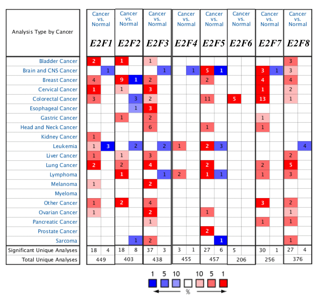 E2Fs, a group of genes that encode a family of transcription factors (TFs) in higher eukaryotes, are generally subdivided into two groups based on functions: transcriptional activators (E2F1, E2F2, and E2F3a) and transcriptional repressors (E2F3b and E2F4-8) [1]. E2F family members play a major role in cell cycle regulation and DNA synthesis in mammalian cells [2]. The expression of E2F activators is deregulated in several human malignancies, including bladder cancer [3], breast cancer [4], ovarian cancer [5], prostate cancer [5], gastrointestinal cancer [6], and lung cancer [7,8].