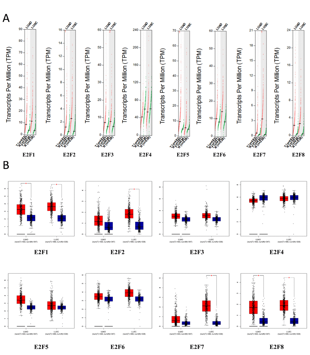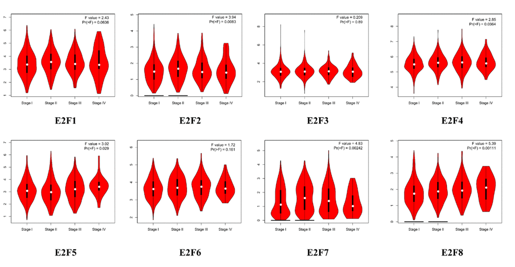 Using GEPIA (Gene Expression Profiling Interactive Analysis) dataset (http://gepia.cancer-pku.cn/), we compared the mRNA expression of E2F factors between LC and lung tissues. The results indicated that the expression levels of E2F1, E2F2, E2F3, E2F5, E2F6, E2F7, and E2F8 were higher in lung adenocarcinoma and squamous cell lung carcinoma tissues than in lung tissues, whereas and the expression level of E2F4 was lower in the former than in the latter (Figure 2). We also analyzed the expression of E2Fs with tumor stage for lung adenocarcinoma and squamous cell lung carcinoma. E2F2, E2F4, E2F5, E2F7, and E2F8 groups significantly varied, whereas E2F1, E2F3, and E2F6 groups did not significantly differ (Figure 3).