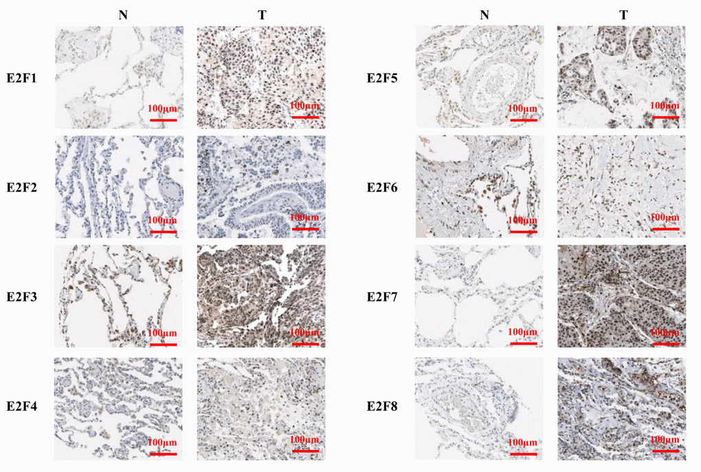 We performed IHC to test E2F proteins expression in LC tissues and their counterparts and to examine the expression of E2Fs in LC. We found that E2F1, E2F2, E2F7, and E2F8 proteins were more highly expressed in the LC tissues than in the normal lung tissues (Figure 4).