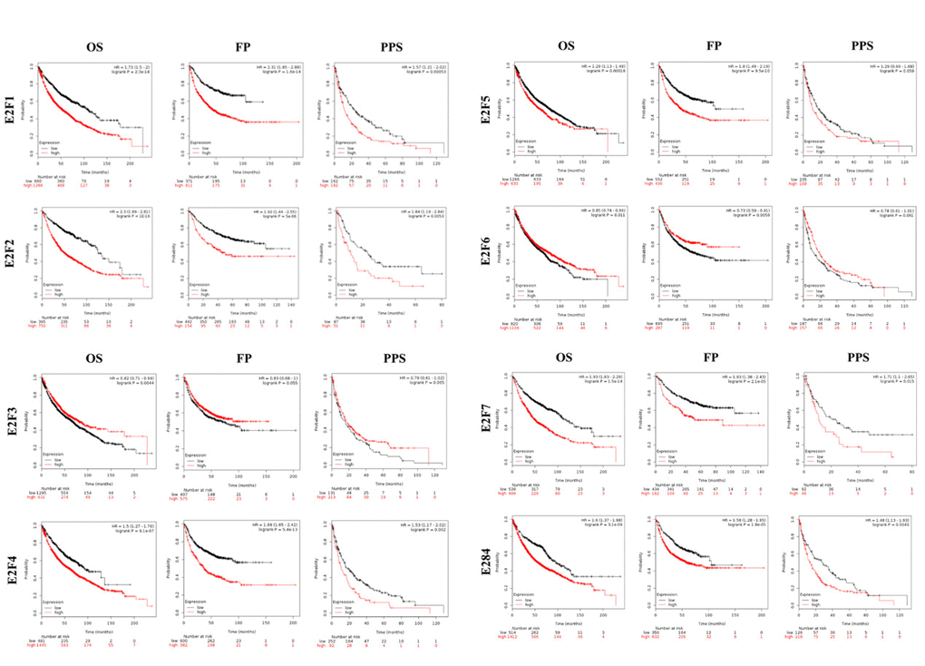The prognostic value of E2Fs mRNA expression was evaluated using an online database, Kaplan-Meier Plotter (www.kmplot.com) [55], which contained gene expression data and survival information of 2,437 clinical lung cancer patients (http://kmplot.com/analysis/index.php?p=service&cancer=lung). To analyze the overall survival (OS), progression-free survival (FP), and post progression survival (PPS) of patients with lung cancer, patient samples were split into two groups by median expression (high vs. low expression) and assessed by a Kaplan-Meier survival plot, with the hazard ratio (HR) with 95% confidence intervals (CI) and logrank p value. Only the JetSet best probe set of E2Fs were chosen to obtain Kaplan-Meier plots in which the Number-at-risk is indicated below the main plot.