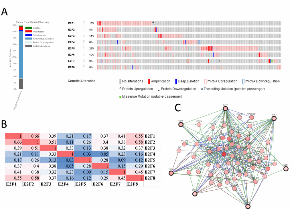 We analyzed the E2F alterations, correlations, and networks by using the cBioPortal online tool for lung adenocarcinoma (TCGA, Provisional). http://www.cbioportal.org/ index.do?session_id=5a37ba8e498eb8b3d56242fb. E2Fs were altered in 257 samples out of 522 patients with lung adenocarcinoma (49%). Two or more alterations were detected in almost half of the samples (128 samples) (Figure 6A). We also calculated the correlations of E2Fs with each other by analyzing their mRNA expression (RNA Seq V2 RSEM) via the cBioPortal online tool for lung adenocarcinoma (TCGA, Provisional), and Pearson’s correction was included. The results indicated significant and positive correlations in the following E2Fs: E2F1 with E2F2, E2F7, and E2F8; E2F2 with E2F1, E2F3, and E2F8; E2F3 with E2F2; E2F7 with E2F1 and E2F8; and E2F8 with E2F1, E2F2, and E2F7 (Figure 6B). We then constructed the network for E2Fs and the 50 most frequently altered neighbor genes. The results showed that the cell cycle-related genes, including CDK2, CDK4, CCNE1, CCNE2, CDKN1B, and CDKN2A, were closely associated with E2F alterations (Figure 6C).