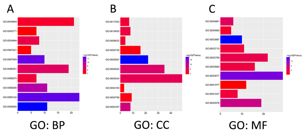 The functions of E2Fs and the genes significantly associated with E2F alterations were predicted by analyzing Gene Ontology (GO) and Kyoto Encyclopedia of Genes and Genomes (KEGG) in the Database for Annotation, Visualization, and Integrated Discovery (DAVID) (https://david.ncifcrf.gov/summary.jsp). GO enrichment analysis predicted the functional roles of target host genes on the basis of three aspects, including biological processes, cellular components, and molecular functions. We found that GO:0007049 (cell cycle), GO:0000082 (G1/S transition of mitotic cell cycle), GO:0000122 (negative regulation of transcription from RNA polymerase II promoter), and GO:0045944 (positive regulation of transcription from RNA polymerase II promoter) were significantly regulated by the E2F alterations in lung adenocarcinoma (Figure 7A). GO:0005667 (TF complex), GO:0000307 (cyclin-dependent protein kinase holoenzyme complex), GO:0004693 (cyclin-dependent protein serine/threonine kinase activity), and GO:0004861 (cyclin-dependent protein serine/threonine kinase inhibitor activity) were also significantly controlled by these E2F alterations (Figures 7B and C). They are well-known genes associated with cell cycle.